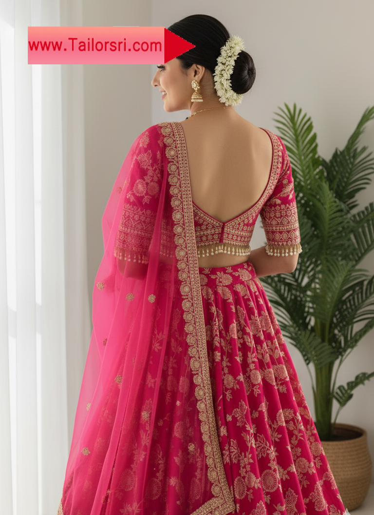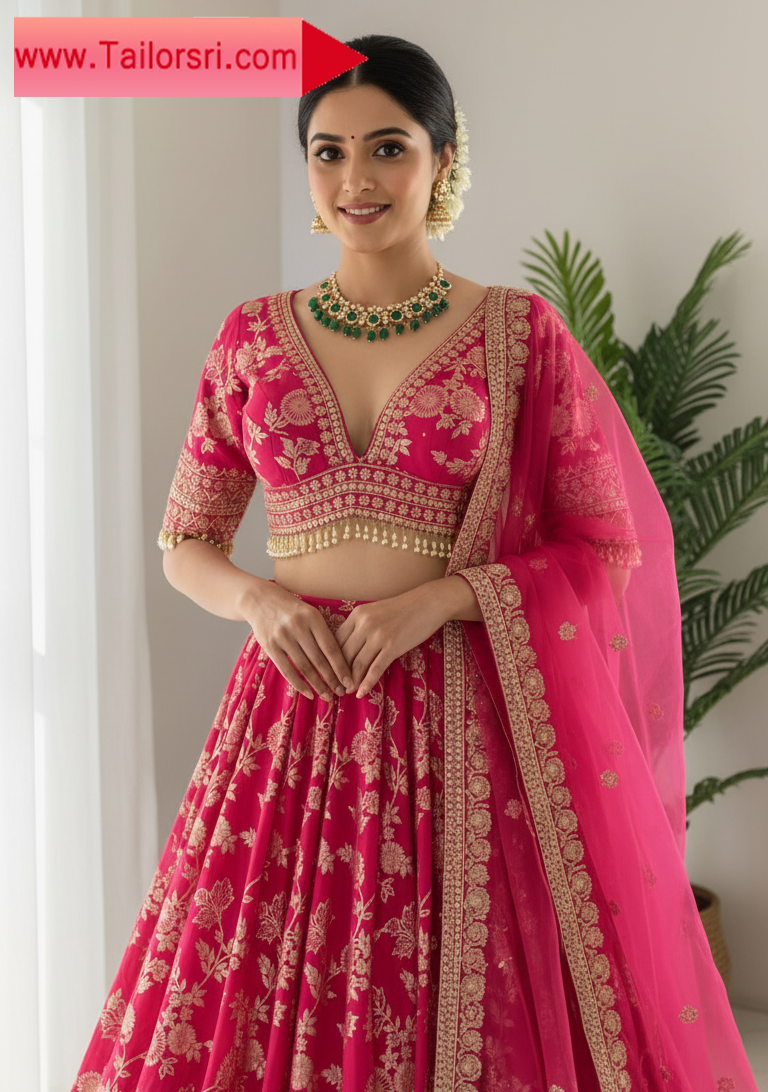 This vibrant raspberry pink lehenga set is a celebration of traditional Indian craftsmanship. The ensemble features intricate gold zari embroidery in a delicate floral and vine pattern, gracing both the full-flared lehenga skirt and the matching blouse. The blouse boasts an elegant V-neckline adorned with a charming pearl and bead fringe, adding a touch of playful sophistication. Completing the set is a soft net dupatta, beautifully edged with gold embroidery. Perfect for weddings, festive occasions, or grand celebrations, this lehenga set exudes grace and charm.