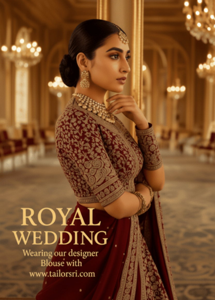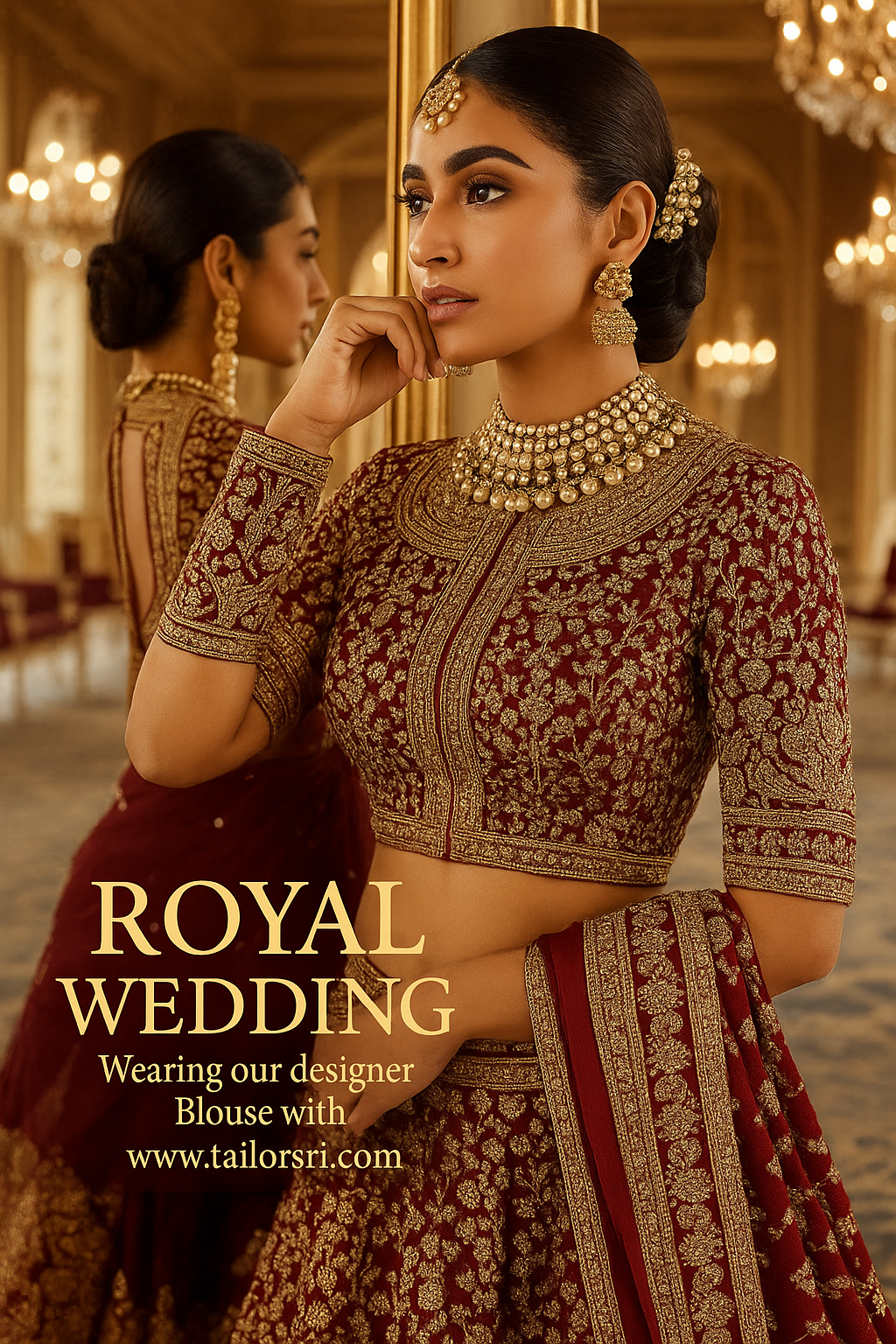 Step into regal elegance with our Royal Bridal Designer Blouse, crafted in luxurious maroon silk and adorned with intricate golden zari, sequins, and stone embroidery. Perfect for weddings, receptions, and grand occasions, this blouse pairs seamlessly with lehengas or silk sarees, giving you a timeless royal look.